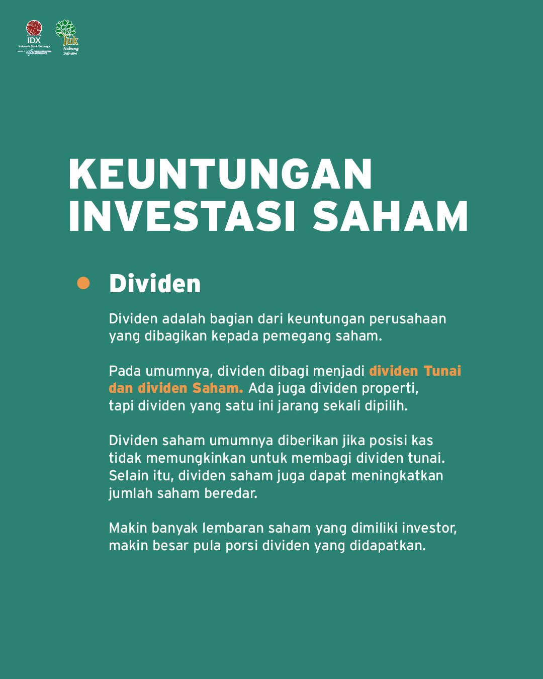 Investasi dalam saham adalah pembelian kepemilikan kecil di sebuah perusahaan. Jika perusahaan tumbuh dan menghasilkan keuntungan, investor dapat merasakan manfaat dari kenaikan harga saham dan dividen yang dibayarkan.